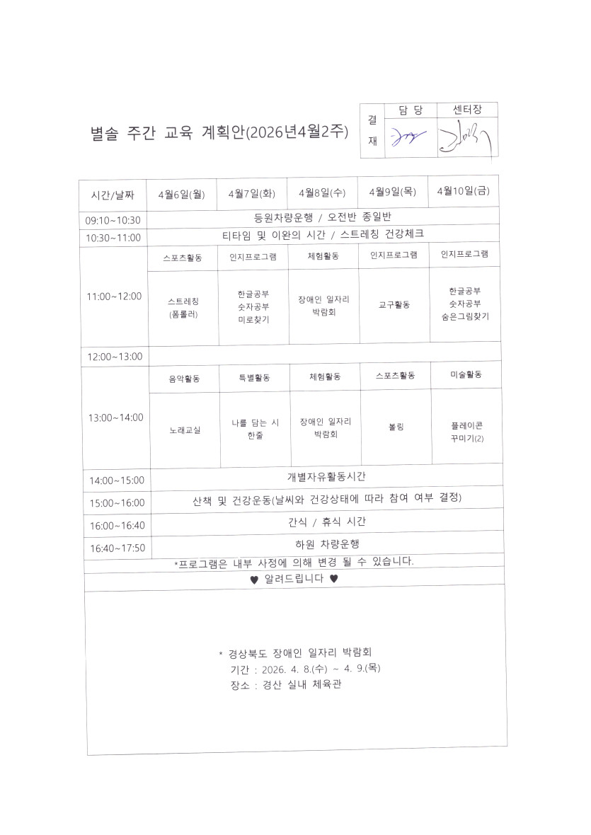 별솔주간보호센터 2026년 4월 2주차 주간계획 페이지 정보 작성자 최고관리자 댓글 0건 조회 55회 작성일 26-04-03 09:52 본문 4월 2주차 주간계획 목록 다음글별솔주간보호센터 2026년 4월 1주차 주간계획 26.03.30 댓글목록 댓글목록 등록된 댓글이 없습니다.