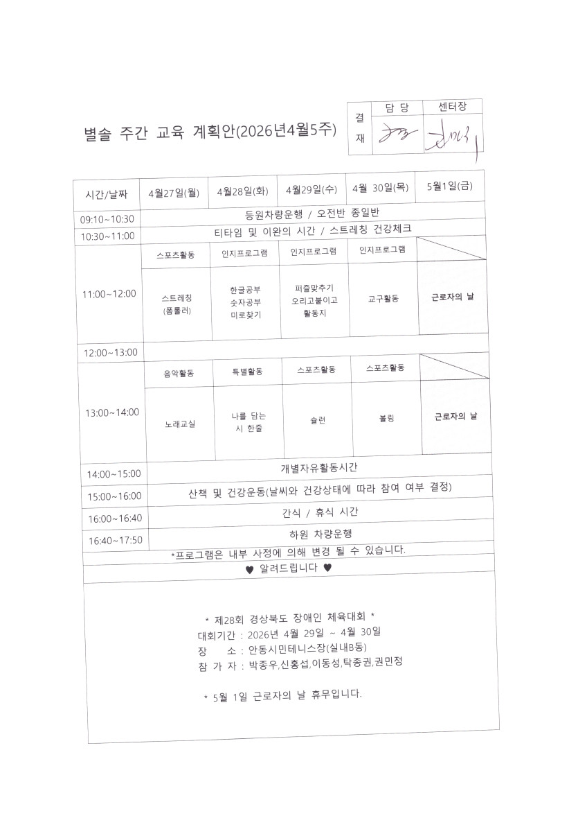 별솔주간보호센터 2026년 4월 5주차 주간계획 페이지 정보 작성자 최고관리자 댓글 0건 조회 24회 작성일 26-04-24 16:00 본문 4월 5주차 주간계획 목록 다음글별솔주간보호센터 2026년 4월 4주차 주간계획 26.04.17 댓글목록 댓글목록 등록된 댓글이 없습니다.